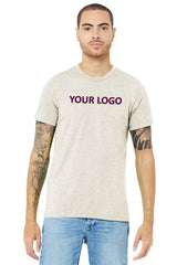 50% poly 25% combed and ring-spun cotton 25% rayon, 40 single 3.8 oz.; Black Heather Triblend: 70% combed and ring-spun cotton, 15% poly, 15% rayon; Semi-relaxed fit; Side seamed; Tear-away label