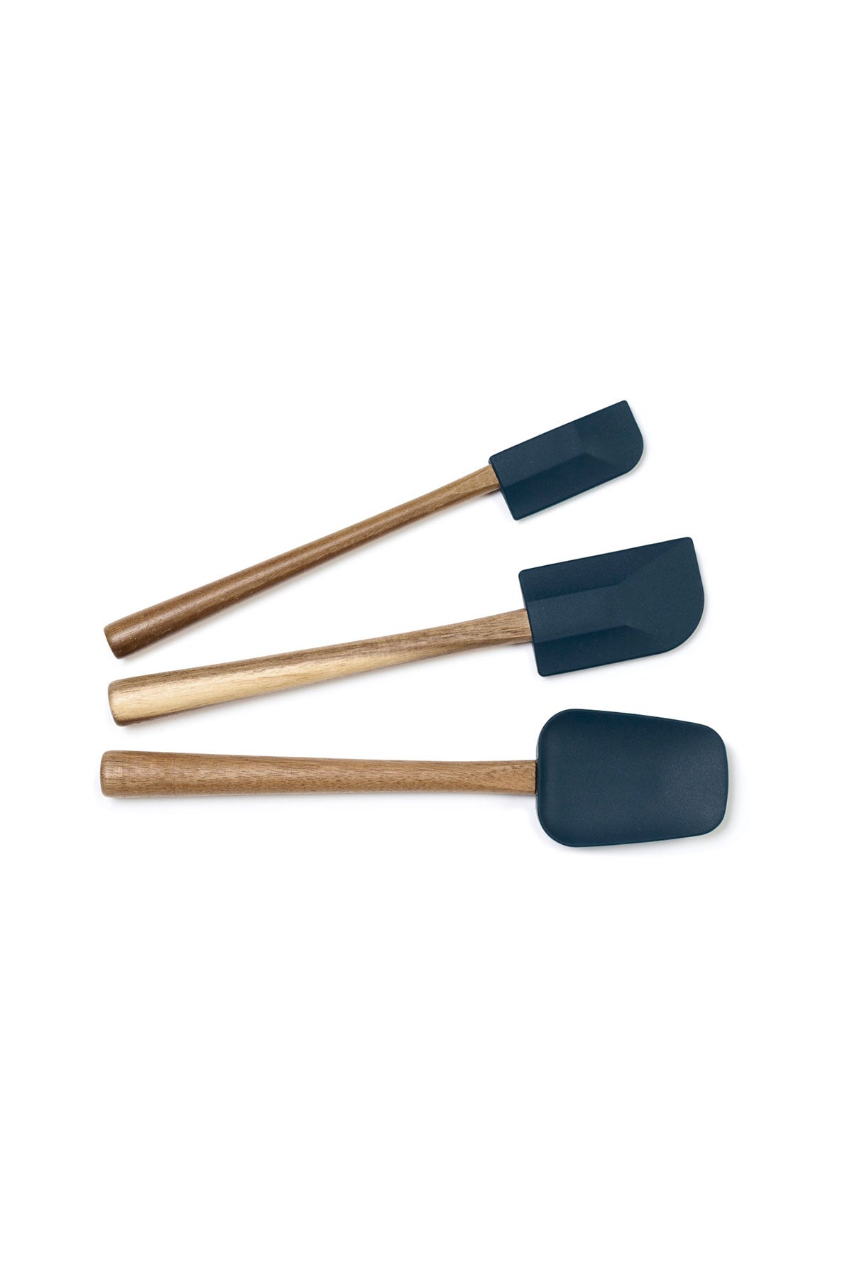 Stir, scrape, fold, and scoop your way to success with this set of La Cuisine silicone spatulas This set includes a classic spatula and spoonula - both versatile essentials for better baking, frosting and meal making and a small offset scraper, perfect for smaller jobs or making sure you got ALL of the peanut butter out of the jar The silicone heads are heat-resistant AND non-scratch, meaning they’re safe to use up to 400’F and will leave your bakeware and non-stick pans looking good as new Box included provides use and care instructions Please note only the Spoonula is being decorated Box dimensions: 11.25"L x 3"W x 1.25"H Bamboo and wood products are prone to color variances and will vary between lots Due to the nature of bamboo and wood material, variations in laser imprinting quality and consistency may occur